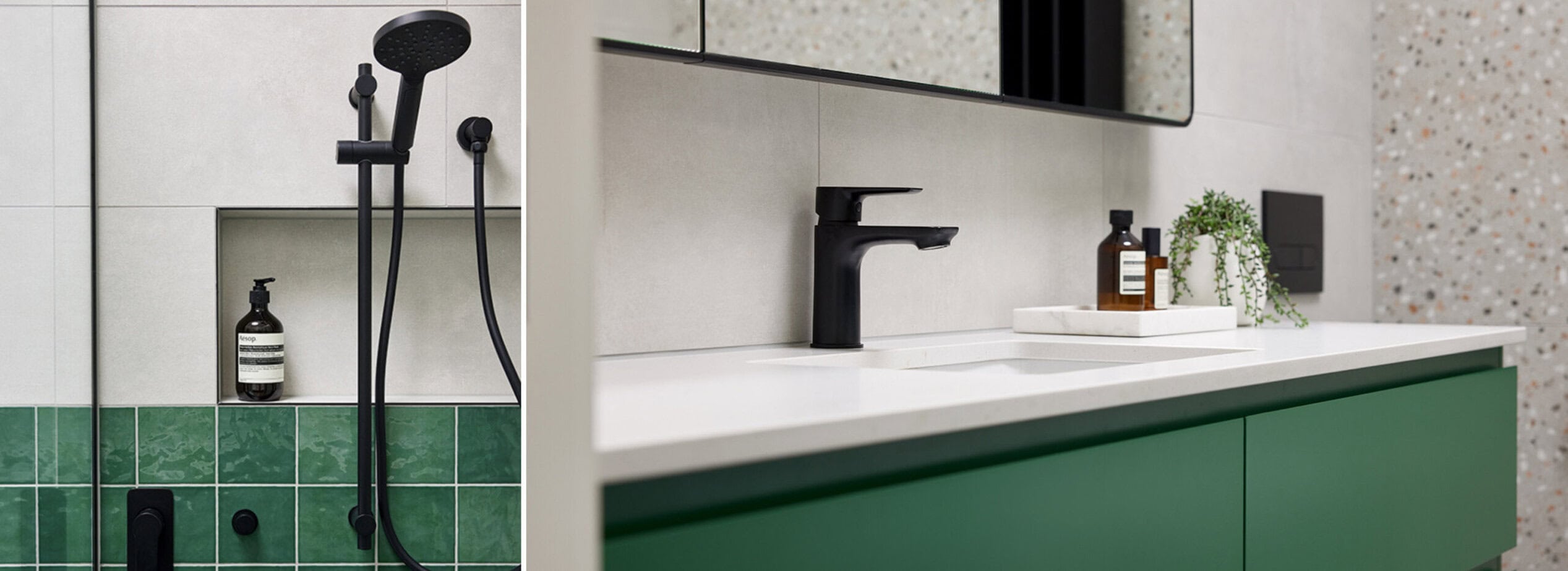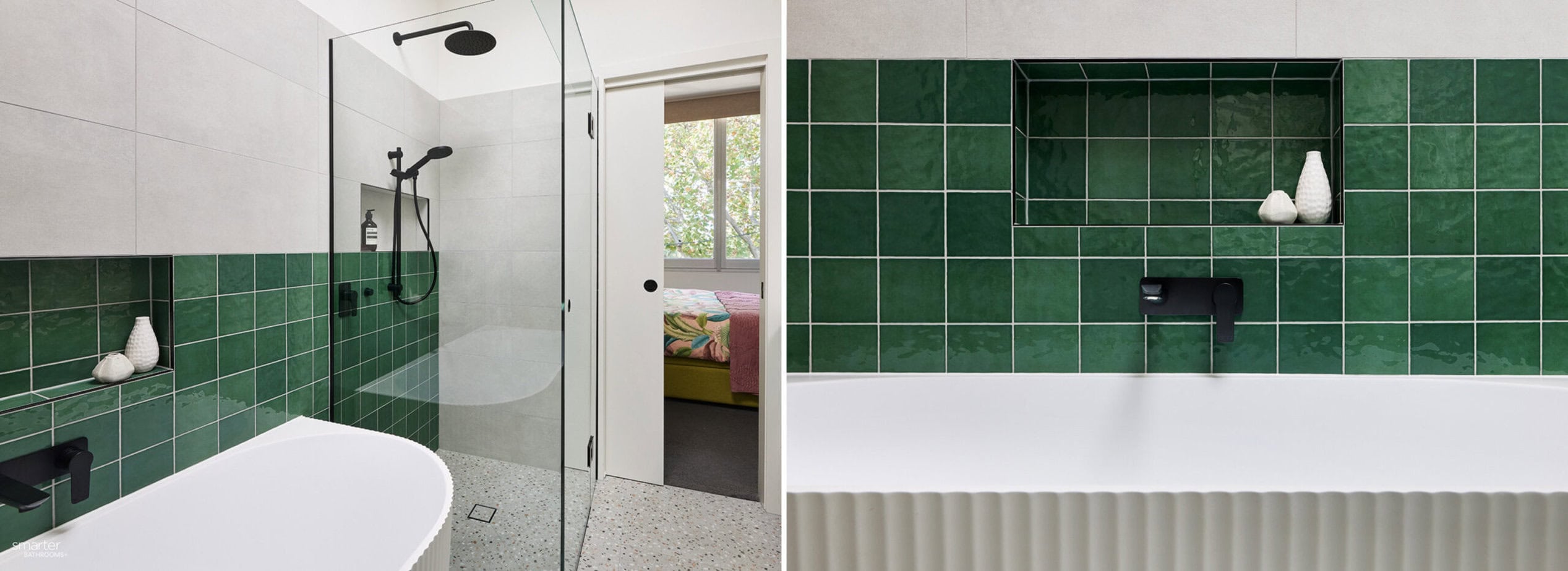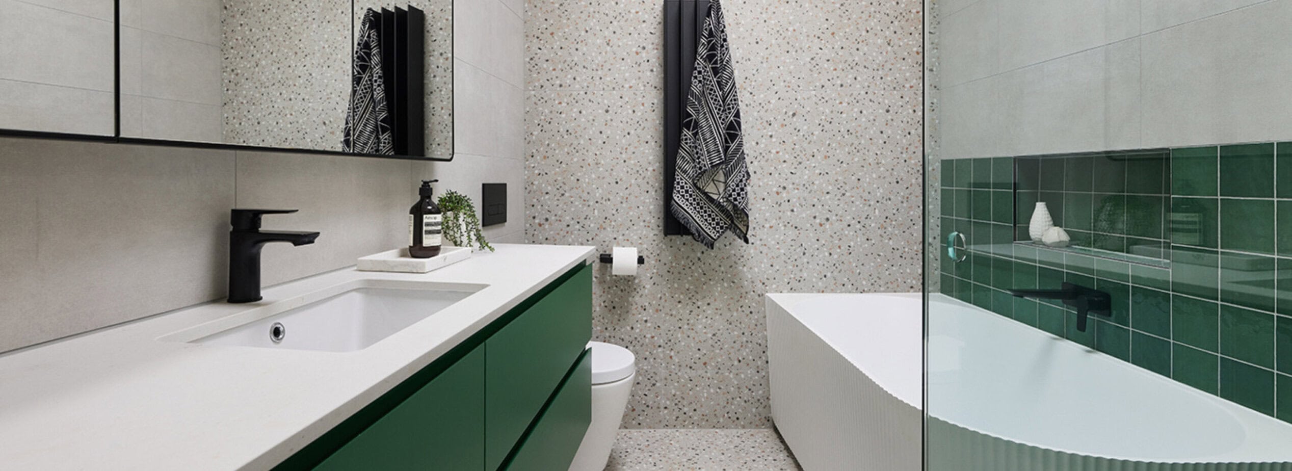 A bold green vanity and wall tiles are unexpected choices for a bathroom, but this suited the client’s personality perfectly and quickly became a feature of the space. The boldness of the green was complimented nicely by the apricot terrazzo tiles and calmed by the addition of the white.