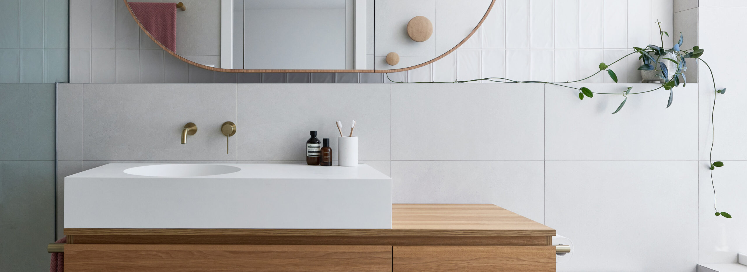 The vanity area featured a seamless solid surface vanity top in crisp white, accompanied by a single basin to maximize bench space. A warm timber veneer vanity cabinet and a large oval mirror cabinet in American Oak were added to provide storage and create a cohesive design. The vanity cabinet was set against subtle white textured wall tiles.