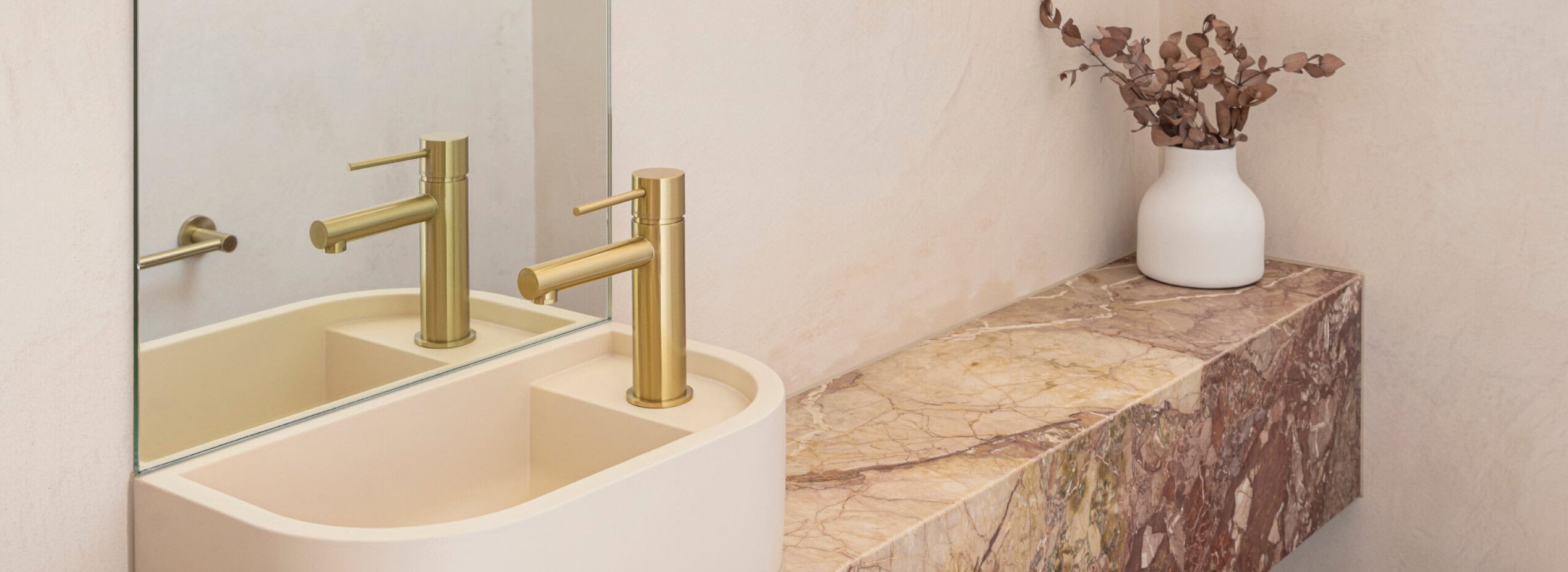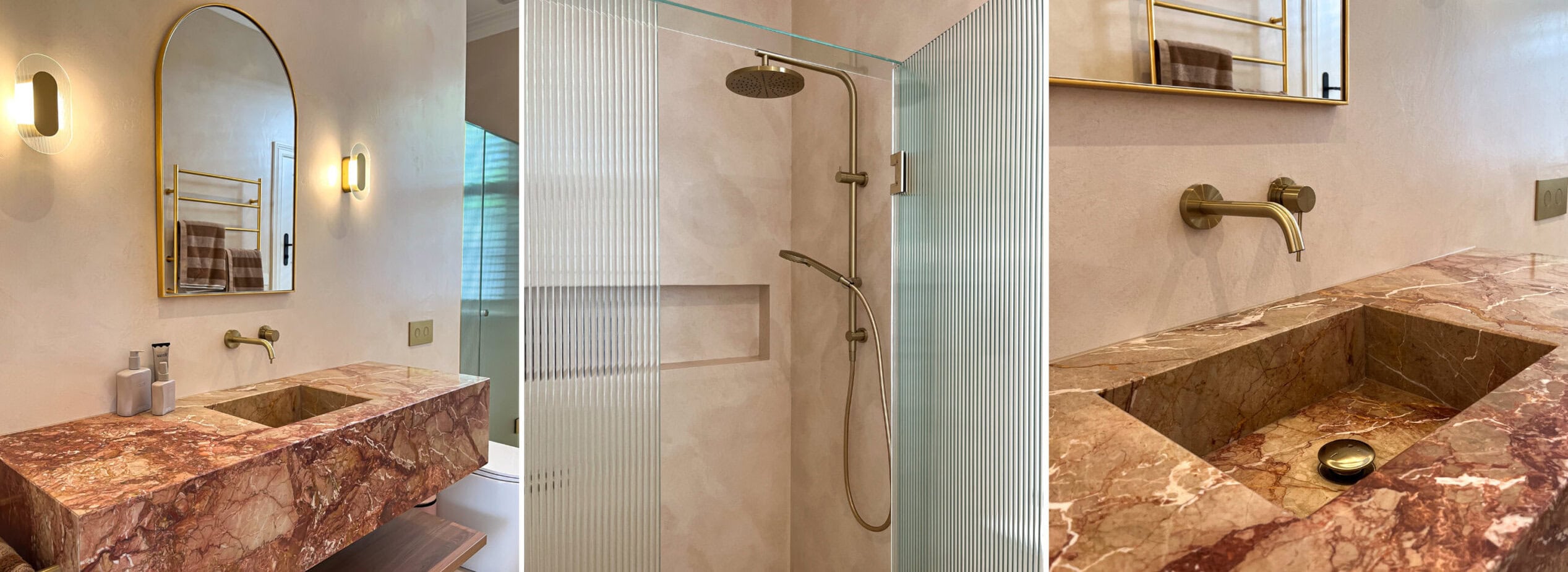 The hero piece of this bathroom is the exquisite natural marble Breccia Pernice, which adds depth and character to the space. This is beautifully complemented by microcement applied across all walls, creating a seamless and understated backdrop. Gold fittings elevate the design, infusing the room with warmth and a touch of glamour, while the fluted glass shower screen introduces another layer of texture, adding a sophisticated visual element to the space.