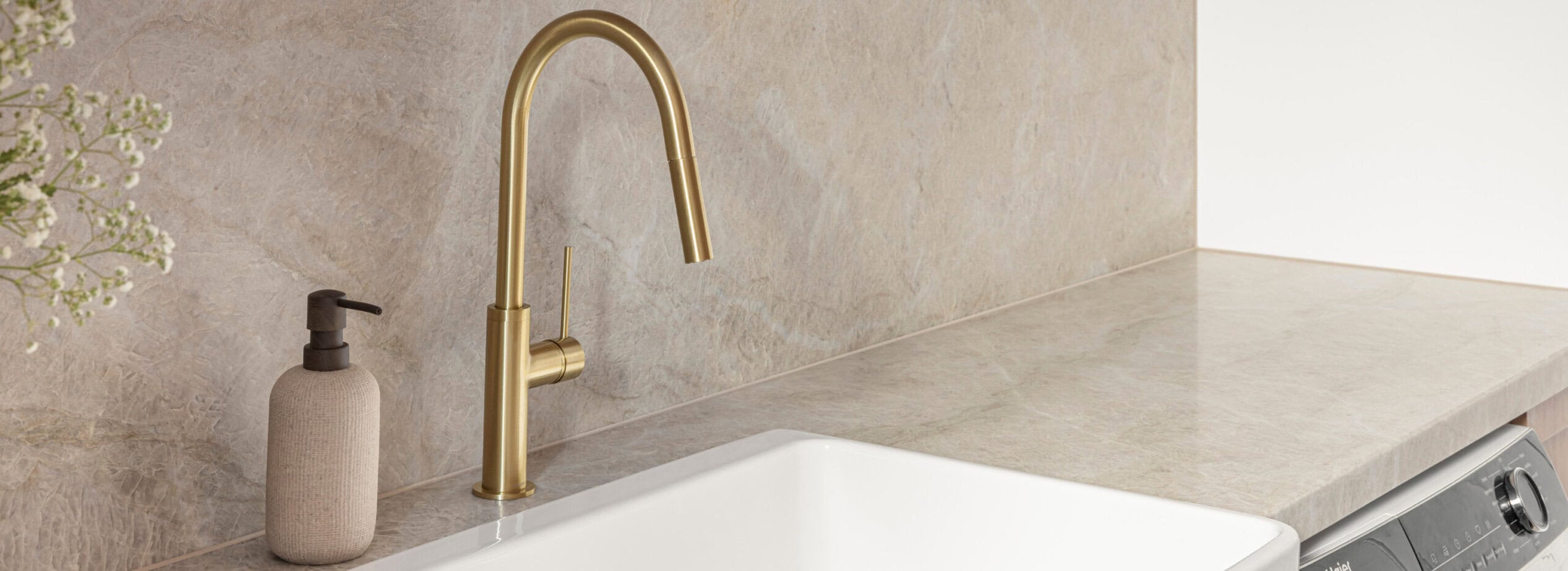 In the laundry, Boston Oak Laminex cabinetry with reversed finger-pull joinery exudes elegance and functionality. This is paired with a striking custom steel door, creating a sense of grandeur. The soft-toned Taj Mahal Quartzite benchtop offers both durability and a pared-back natural beauty that blends effortlessly with the overall aesthetic.