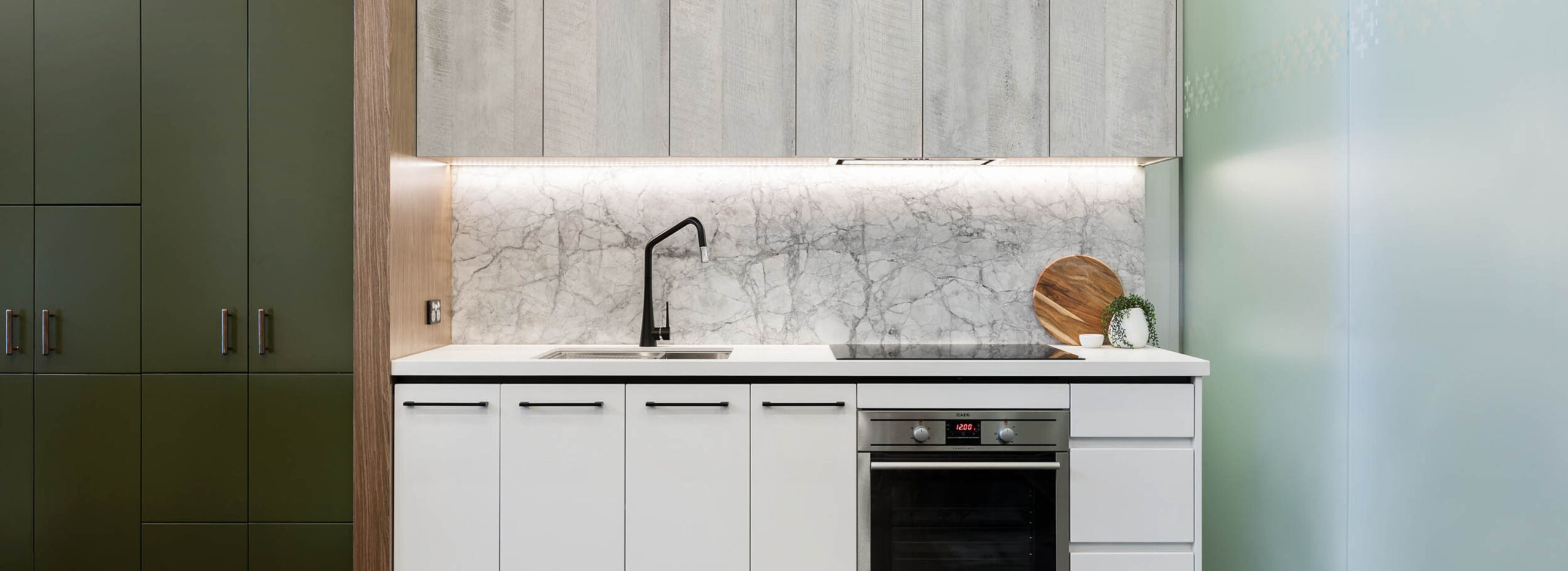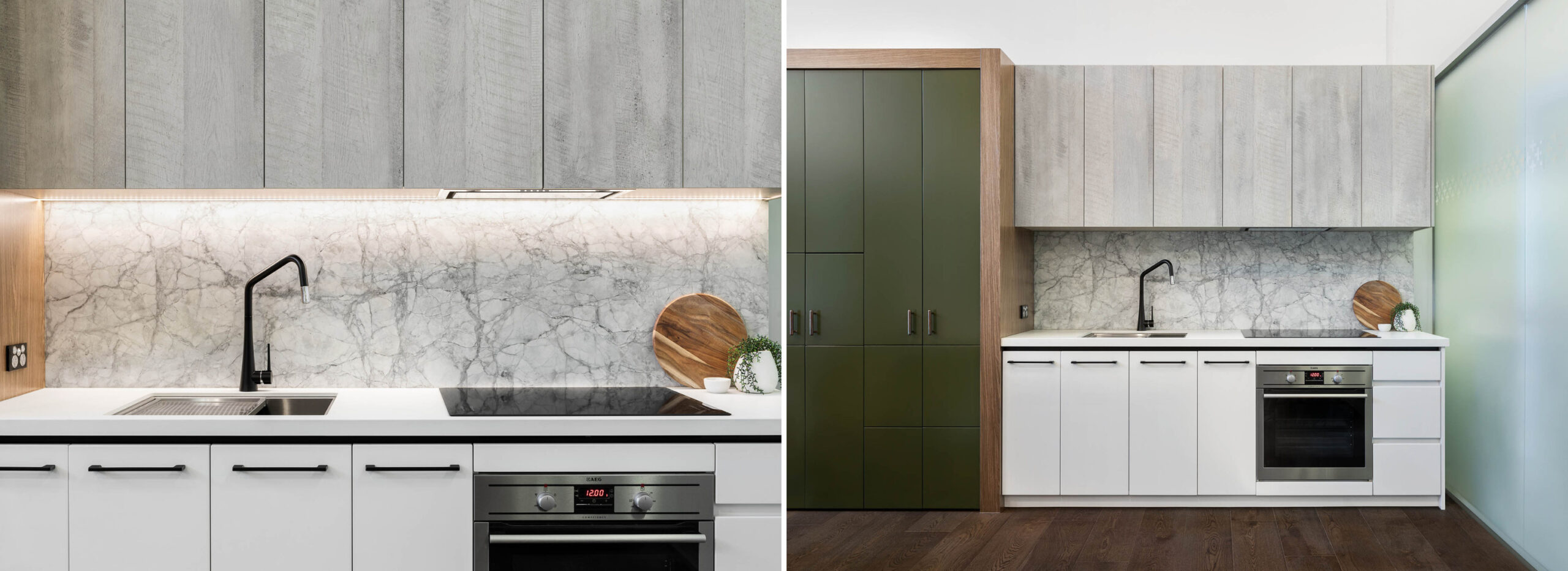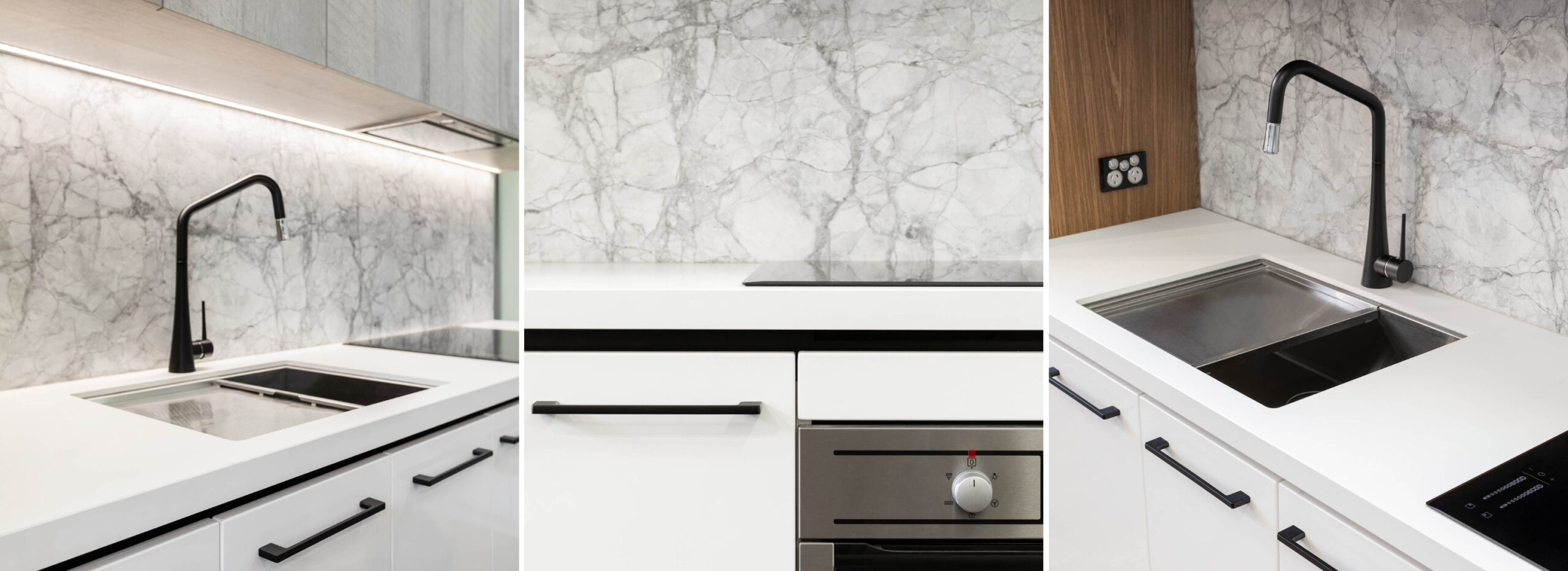 The centerpiece of this kitchen is the ever-popular natural marble splashback, highlighted by strip lighting that accentuates its dramatic natural veins.