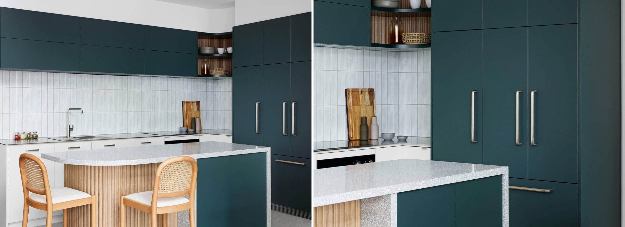 The colour palette sets the tone for relaxed sophistication, with dark forest green accents paired with lighter base cabinets and scalloped timber highlights.