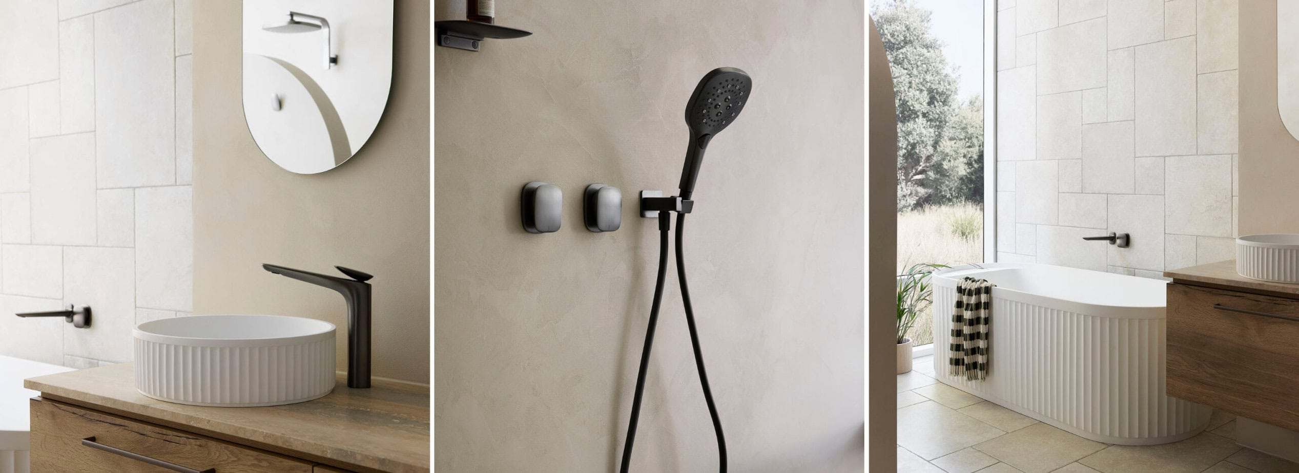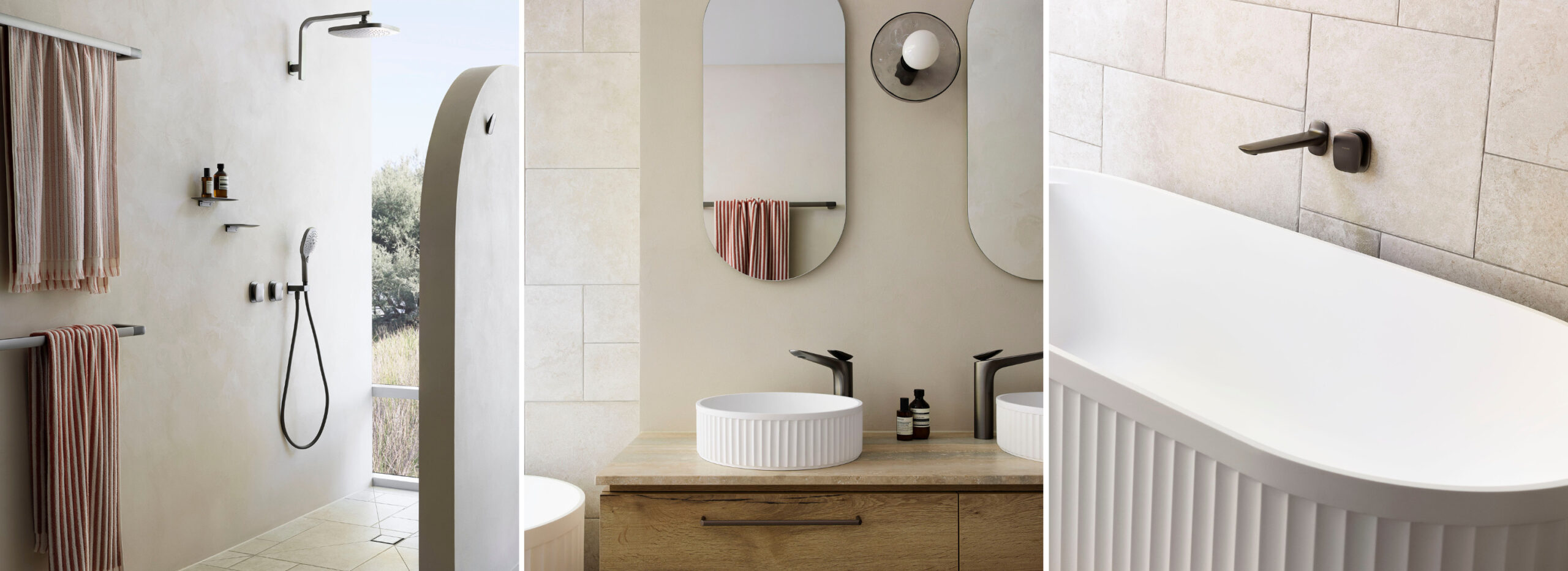 Elevating the space with exquisite craftsmanship and contemporary design, our selection of products adds a touch of sophistication to the bathroom. The Phoenix Nuage mixers and accessories in Brushed Carbon finish offer a modern aesthetic while maintaining a sense of understated elegance. The Fienza Minka bath and basins seamlessly blend form and function, embodying luxury and practicality in equal measure.