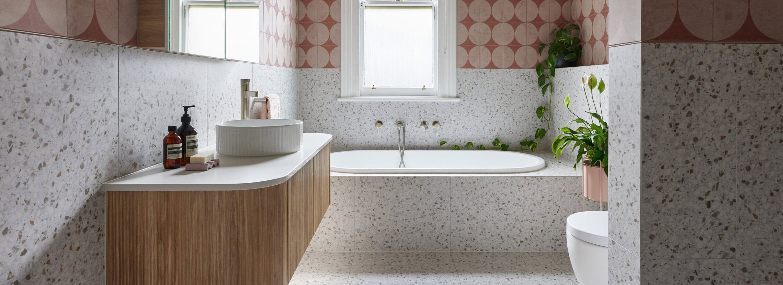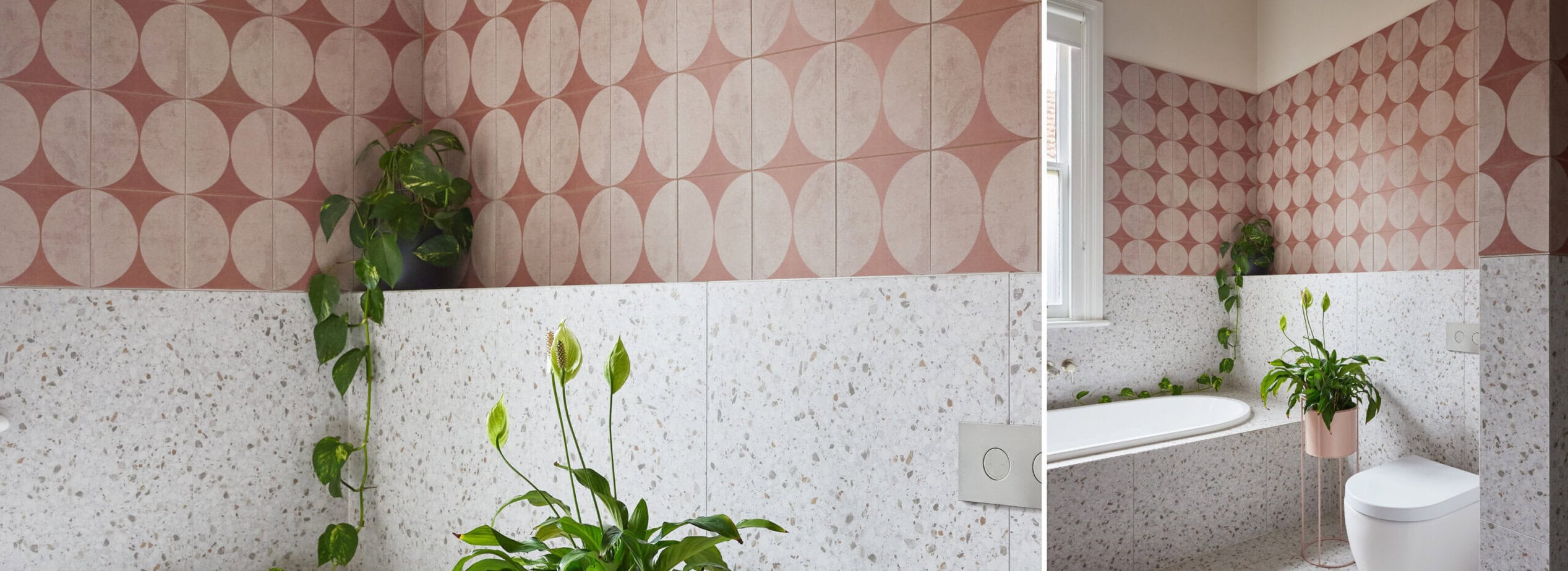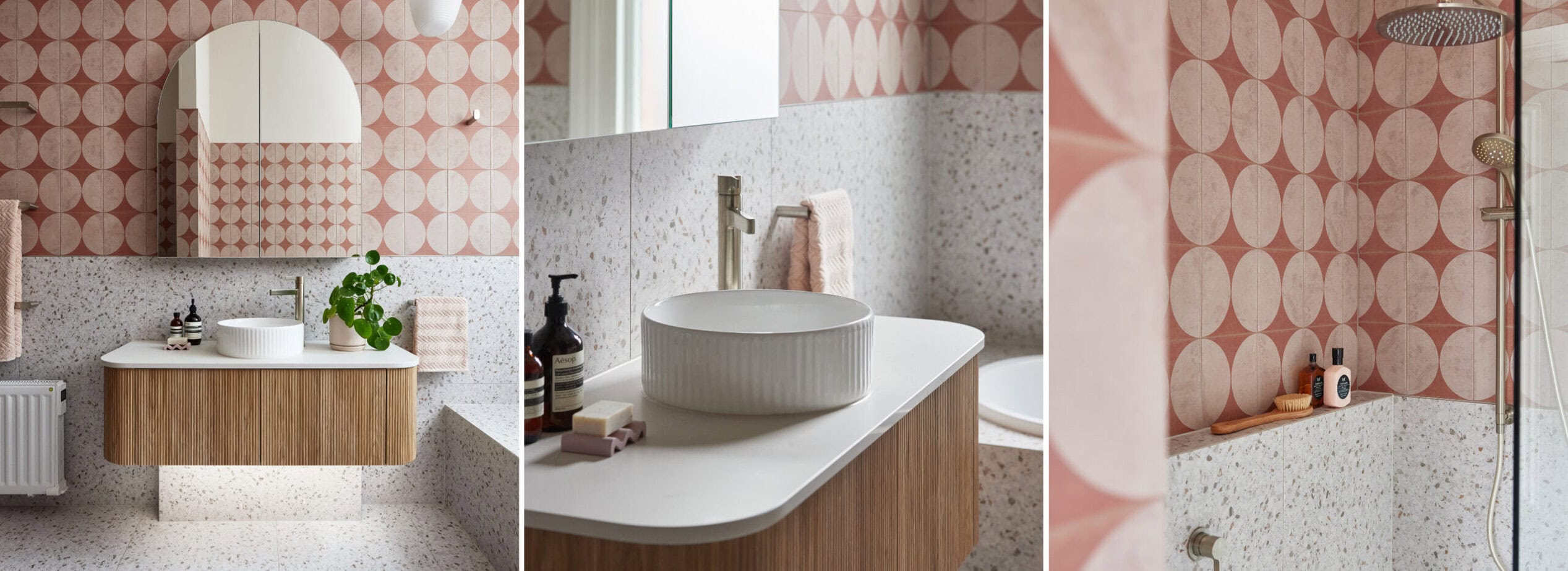 The complete transformation showcased a mix of traditional and modern design elements, with terrazzo tiles complementing playful pink pattern tiles.